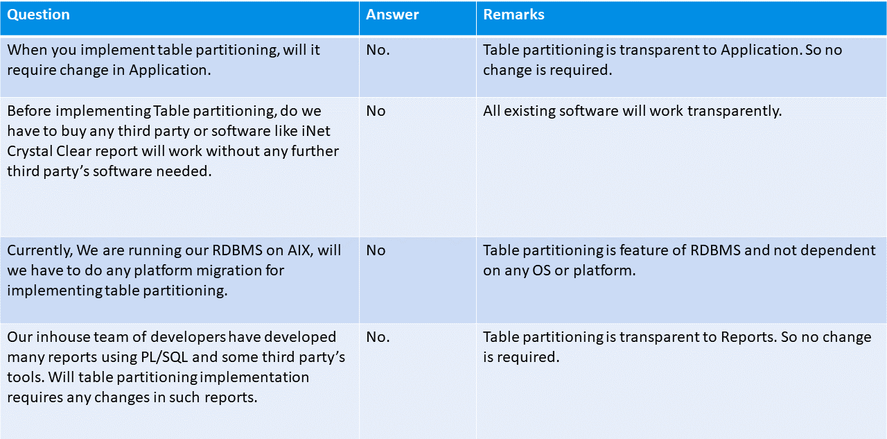 Tempos de backup melhorados: Várias actividades de manutenção, como a reorganização, podem ser efectuadas em partições individuais, o que será muito rápido em comparação com a reorganização de toda a tabela. Trabalhar com partições separadas é mais fácil e rápido, uma vez que certas operações podem ser escolhidas em espaços individuais, o que reduzirá o tempo. A redução do tempo de backup significa que os recursos do sistema estão disponíveis para as transacções dos utilizadores, em vez de serem guardados no armazenamento de backup.